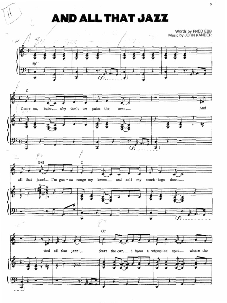 Format chords, tab and lyrics Browse our 19 arrangements of and all that jazz. sheet music is available for piano, voice, guitar and 30 others with 15 scorings and 3 notations in 12 genres. Arrangement for piano, vocal, piano solo and guitar. And all that jazz sheet music. The document is lyrics to the song 'and all that jazz' from.