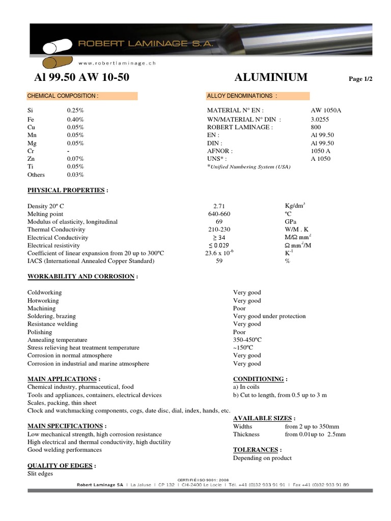 Al 99.5 AW 1050 Aluminium A 1050 Technical Data Sheet RLSA PDF