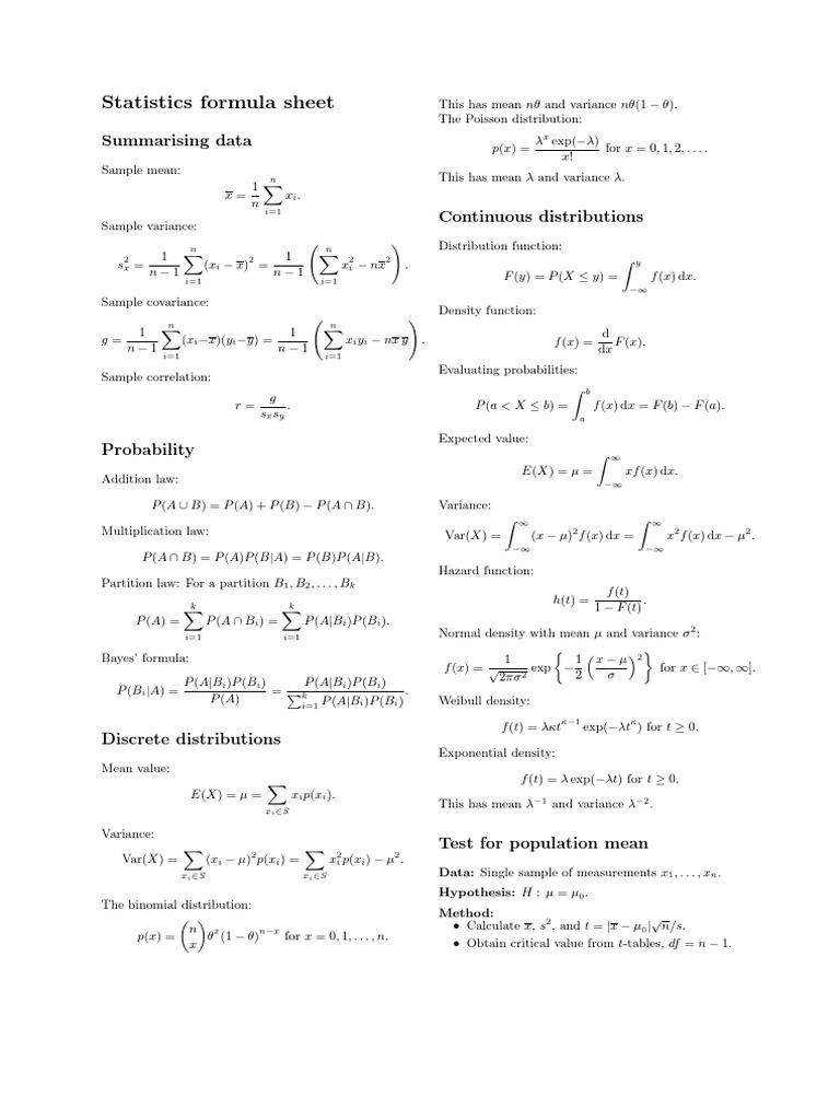 Statistics Probability Formula Sheet - Table entry for c is the critical value required for confidence level c. These basic formulas of statistics & probability functions help users, learners, teachers, professionals or researchers to analyze, model, design & test various statistical surveys &. Table entry for p is the point ( 2) with probability p lying above it. Conditional probability p(ajb) = p(a;b)=p(b) { probability of a, given that b occurred. Conditional probability is probability p(ajb) is a probability function for any xed b.